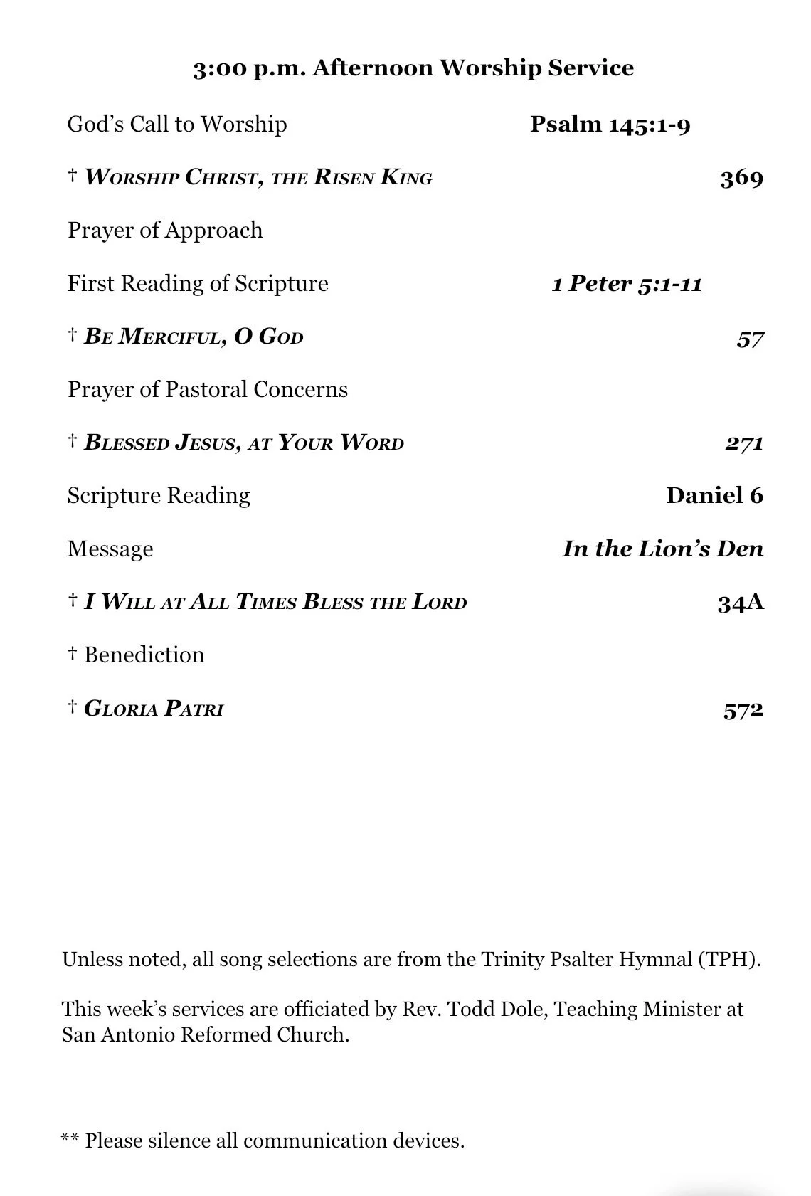 This week’s services are officiated by Rev. Todd Dole, Teaching Minister at San Antonio Reformed Church.